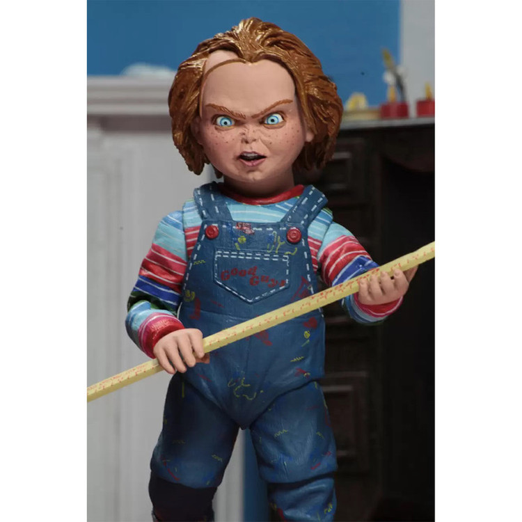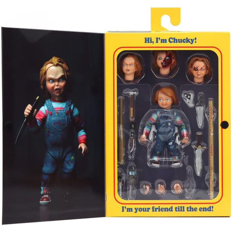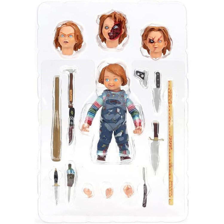 این فیگور 4 اینچ معادل 10 سانتی متر قد دارد. اکشن فیگور Ultimate Chucky در بسته بندی جعبه پنجره لوکس دوستدار کلکسیونر با دریچه باز می شود. ساخته شده از مواد پی وی سی با کیفیت بالا، 100% کاملا نو. مجسمه فوقالعاده قابل جمعآوری پلاستیک سخت پی وی سی، با دقت زیادی به رنگها و جزئیات ساخته شده. از فیلم های ترسناک کلاسیک، عروسکی که روح یک ق زنجیره ای در آن زندگی می کند، درمان نهایی را دریافت می کند! این نسخه قطعی چاکی با مجسمههای بزرگ 4 برابری سر قابل تعویض عرضه میشود و مملو از لوازم جانبی است: چوب بیسبال، چکش، چاقوی وودو، چاقوی شکاری، چاقوی قصابی، تیغ مستقیم، معیار، تپانچه، ساعد راست قابل تعویض با تیغه، دستهای قابل تعویض ، و...