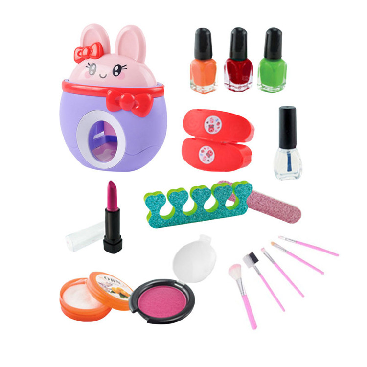 این ست اسباب بازی لوازم آرایشی شامل یک استمپر ناخن بوده که دارای 2 طرح مختلف است که به راحتی روی لاک چاپ میشود، فقط کافیست انگشتان لاک زدهی خود را یکی یکی داخل دستگاه بگذارید و دکمهی بالایی را فشار دهید. برای استفاده از این دستگاه لازم است که حتماً از لاک مخصوص موجود در بسته استفاده کنید .یکی از سه رنگ لاک را انتخاب کنید، بعد از اینکه آن را خوب تکان دادید یک لایه نازک از آن روی ناخنهای خود بگذارید. بعد از گذشت 5 دقیقه و خشک شدن لاک ها میتونید از دستگاه استفاده کنید، به این صورت که یکی از طرح ها را داخل دستگاه قرار دهید و اهرم بالایی را محکم به مدت 2 ثانیه روی هر ناخن فشار دهید. حالا میتوانید محافظ لاک رو روی طرح های ناخنتون بکشید تا دوام بیشتری داشته باشند.در این ست بازی علاوه بر استمپر و کرم پاک کننده تعدادی لوازم آرایش با کیفیت نیز قرار دارد تا این مجموعه یک انتخاب عالی و سورپرایز کننده برای هدیه به دختران بالای 6 سال باشد.
