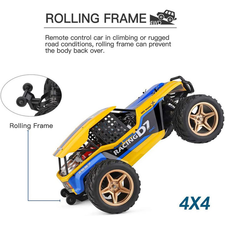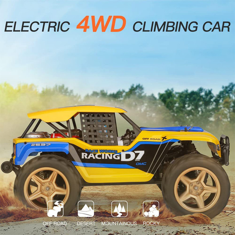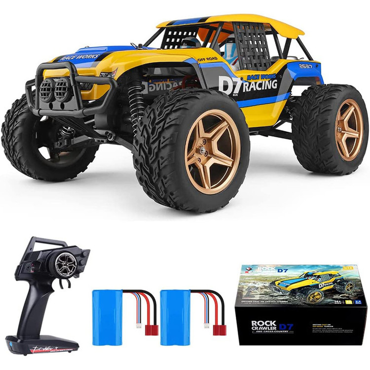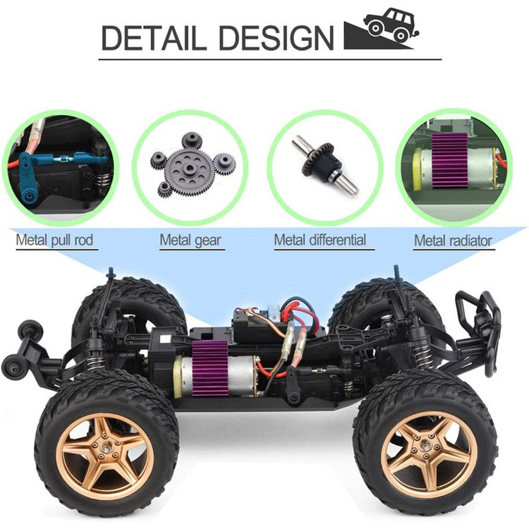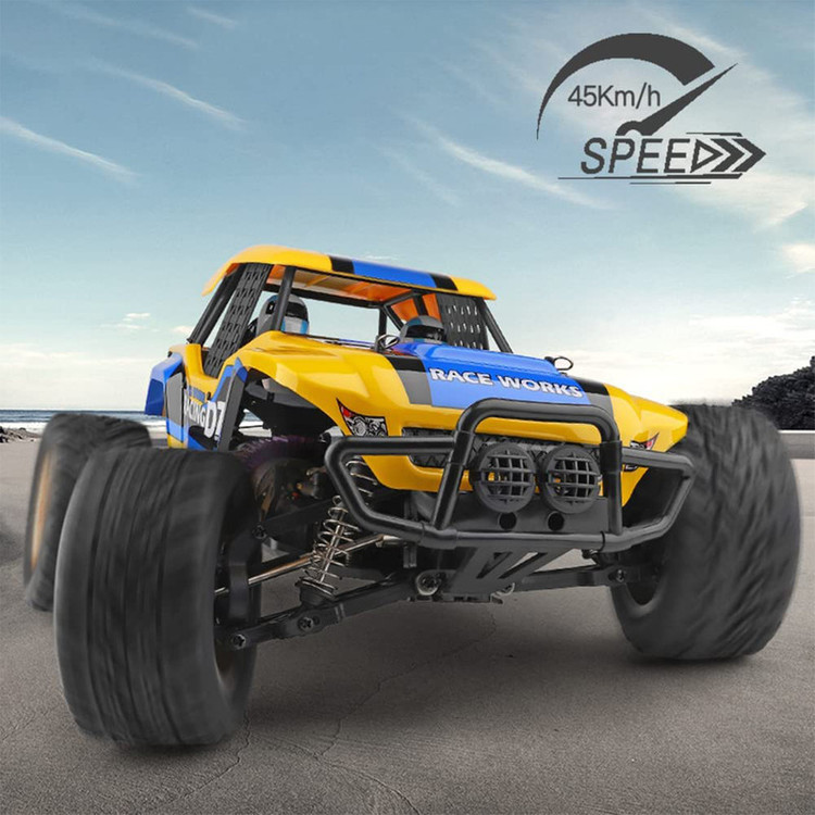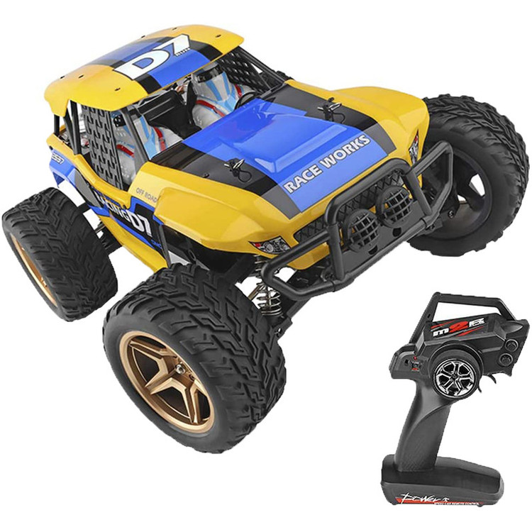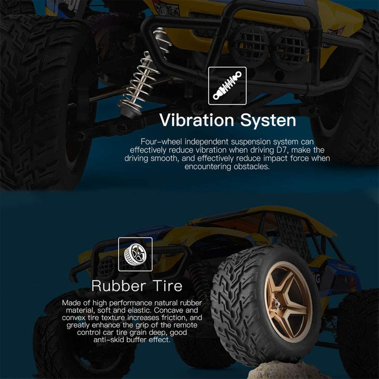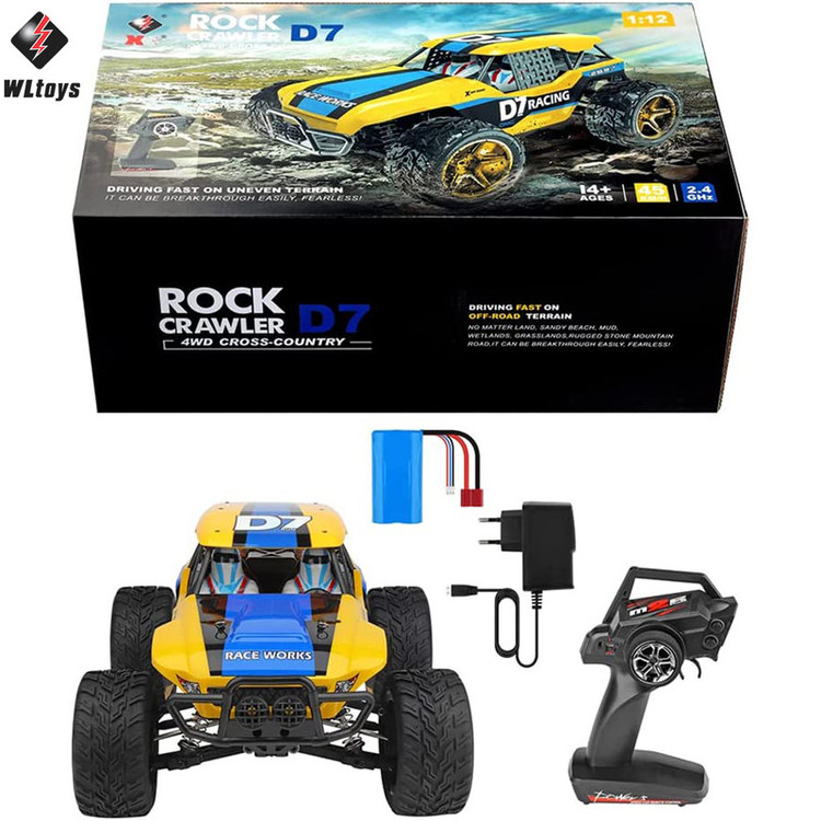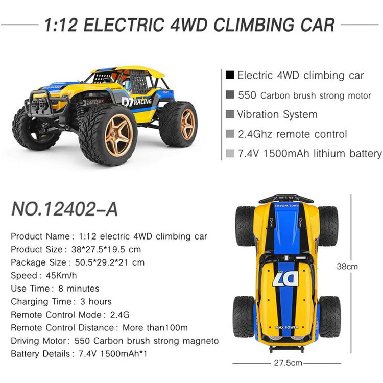 ماشین کنترلی Wltoys 12402-A D7 با کنترل از راه دور از مدل ماشینهای جاده خراب کن RC از شرکت پرطرفدار WLtoys که بیش از دهها ماشین کنترلی جاده خراب کن و پرسرعت ساخته است. مقیاس و اندازه این ماشین کنترلی 1:12 میباشد که استاندارد تمام ماشینهای جاده خراب کن است. همچنین سرعت آن به بیش از 45 کیلومتر بر ساعت میباشد که رانندگی را در مسابقههای ریسینگ عالی و بینظیر میکند. فرکانس فرستنده و ریموت کنترل این ماشین از تکنولوژی قدرتمند با برد 2.4 گیگاهرتز است. همچنین این ماشین به قابلیتهایی مثل سیستم ضد شوک و ضربهگیر که در بدنه آن بکار رفته است، سرعت رانندگی بیش از 45 کیلومتر بر ساعت، چهارچرخ انعطافپذیر و قدرتمند و جاده خراب کن، بدنه باقابلیت ضد آب که هیچ آسیبی نه به بدنه و قطعات داخلی وارد میکند، موتور دارای 550 دور بر دقیقه قوی که سرعت را برای شما به اوج هیجان میبرد.این ماشین قابلیت این را دارد که با چهارچرخ قوی خود از روی هر سطحی بالا بکشد. موتور با 550 دور در دقیقه قوی و قدرتمند، سیستم ویبره و لرزش برای بدنه، ریموت کنترل یا فرستنده با فرکانس 2.4 گیگاهرتز، باتری از جنس مرغوب لیتیوم یون با ولتاژ 7.4 ولت و ظرفیت 1500 میلیآمپر بر ساعت. مدل این ماشین مسابقه 12402-A میباشد که جز بهترین ماشینهای مسابقه شرکت WLTOYS است. اندازه این ماشین 38 در 27.5 در 19.5 سانتیمتر، اندازه جعبه 50.5 در 29.2 در 21 سانتیمتر، سرعت ماشین 45 کیلومتر بر ساعت حداکثر زمان استفاده 8 دقیقه، زمان شارژ کامل 3 ساعت، مدل فرستنده یا ریموت کنترل 2.4 گیگاهرتز، حداکثر برد و فاصله کنترل از راه دور با فرستنده بیشتر از 100 متر، موتور استفادهشده با 550 دور در دقیقه و از جنس مغناطیسی آهنربای کربنی قوی و قدرتمند میباشد.