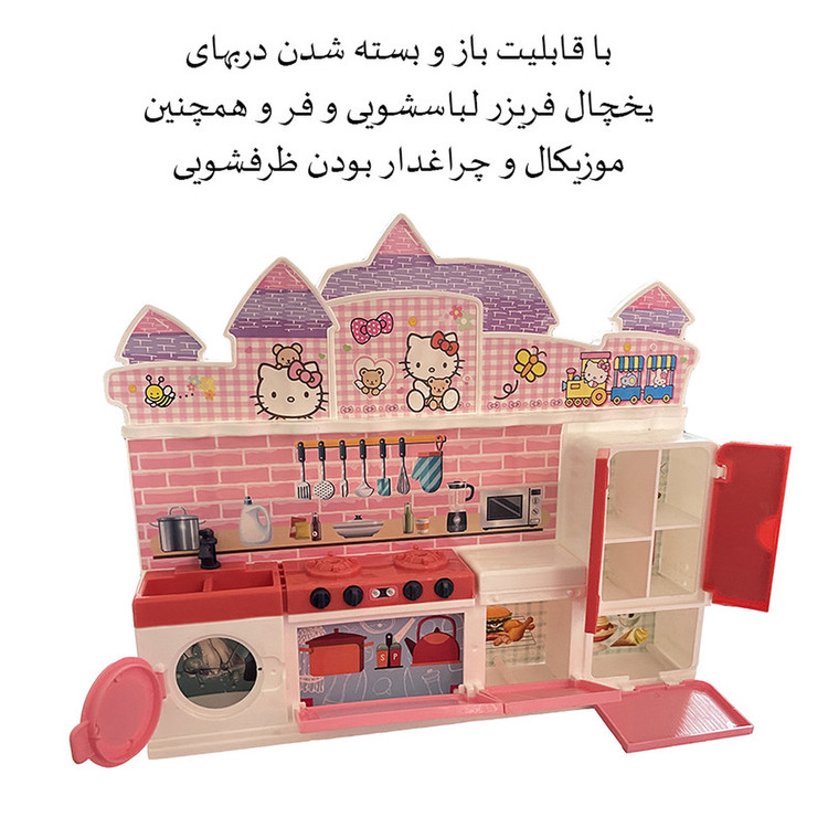 این محصول یک اسباب بازی ست آشپزخانه موزیکال و چراغدار طرح هلوکیتی که شخصیت مورد علاقه دختران است می باشد.این ست تشکیل شده از وسایل آشپزخانه از قبیل ماشین لباسشویی اجاق گاز و اجاق گاز یخچال و فر میباشد که با فشردن دکمه چراغ های ماشین ظرفشویی روشن شده و صدای آب پخش می شود.همچنین این محصول دارای یک بسته 17 تیکه وسایل آشپزخانه از قبیل کتری سرخ کن قابلمه ماهیتابه ملاقه و کارد و... می باشد.از دیگر ویژگی های این محصول باز شدن درب وسایل آشپزخانه می باشد.این محصول باکیفیت کودک شما را ساعت ها سرگرم میکند و باعث رشد قوه تخیل کودک شما و آشنایی کودک با وسایل و ابزار آشپزخانه می شود.