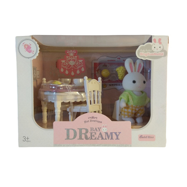 مجموعه خرگوش و لوازم غذا خوری شامل : خرگوش به طول 9 سانتیمتر ، میز و صندلی غذاخوری دو نفره ، قاشق چنگال ، بشقاب ، فنجان نعلبکی از هر کدام دو عدد ، وافل ، بستنی ، انگور و آب میوه است . این مجموعه بازی دارای کیفیت خوب بوده و استاندارد اروپا را دارا میباشد و با بسته بندی زیبا مناسب هدیه دادن میباشد .