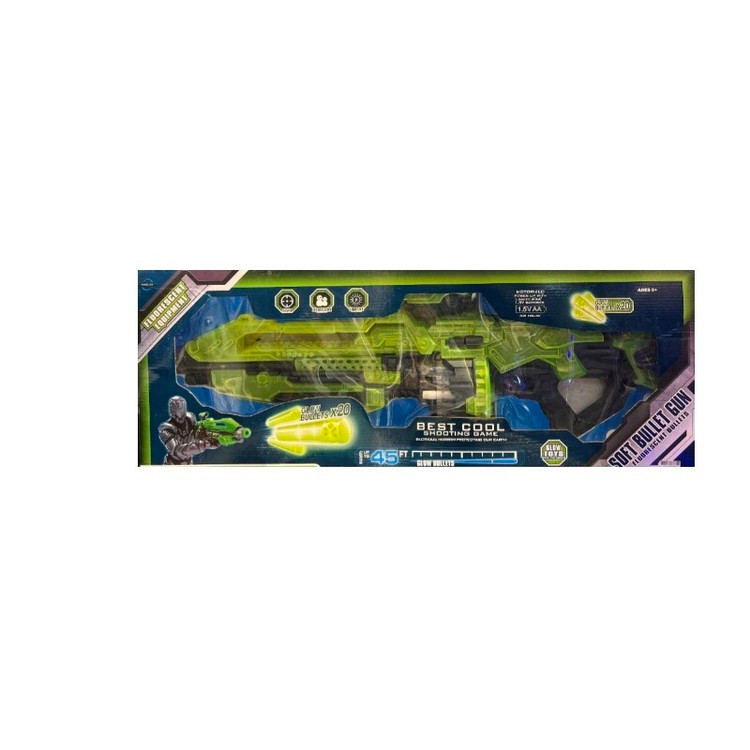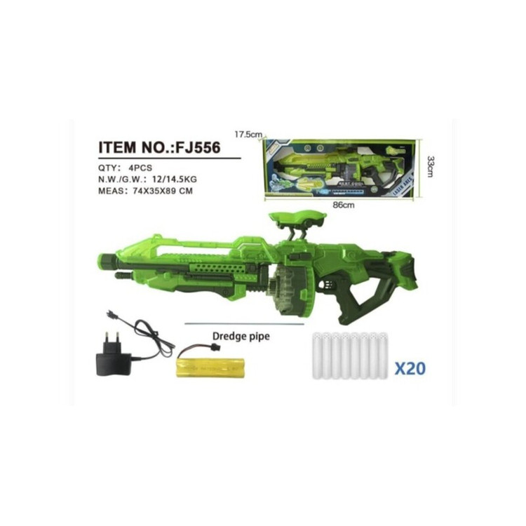 اسباب بازی تفنگ سبز رنگ به همراه تیر ابری که شارژی می باشد که مناسب رده سنی 6 سال به بالا می باشد