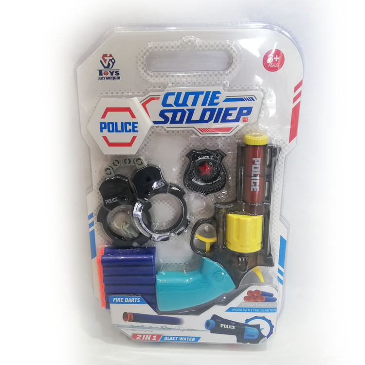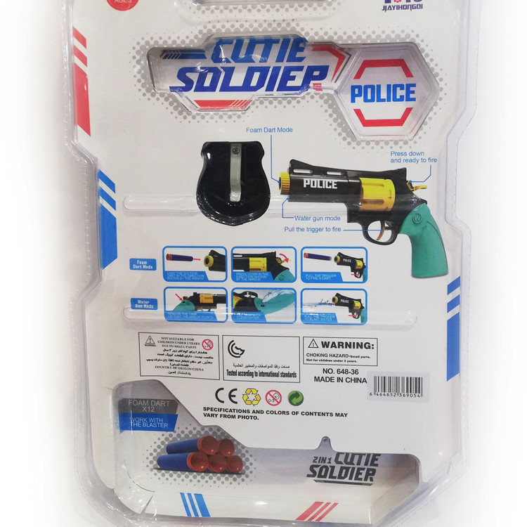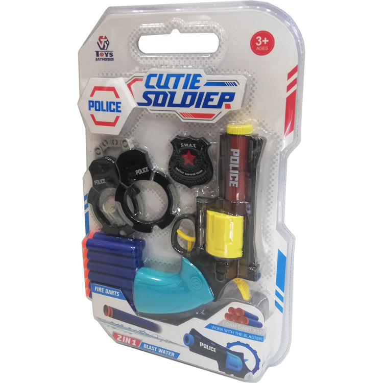 اقلام همراه: تعداد 12 عدد تیر ابری فومی ودستبند پلیس و نشان کلانتر