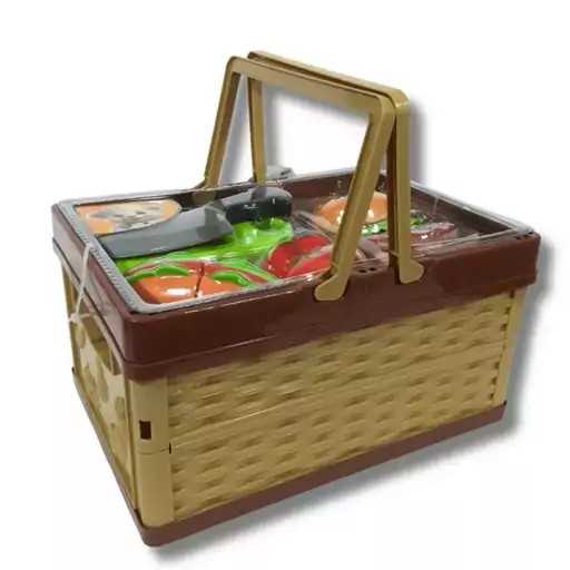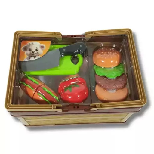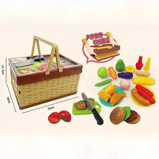 پیکنیک با سبد برش میوه و فست فود! این ست شامل یک سبد پلاستیکی با لوازم مختلف شامل برش فست فود و میوه شامل همبرگر، هات داگ و گوجه، کارد و تخته برش، این ست همچنین دارای ماکت های خوراکی های مختلف است. مناسب کودکان بالای 3 سال