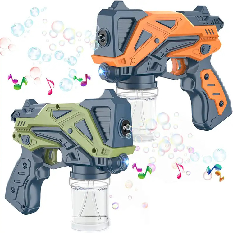 ملودیها و صداهای شاد: همزمان با فشردن ماشه و تولید حباب، آهنگها و ملودیهای کودکانه شاد یا صداهای جذاب و هیجانانگیز (مثل صدای ماشین فضایی، صدای آب یا افکتهای خاص) از اسپیکر داخلی تفنگ پخش میشود. این اصوات نه تنها فضای بازی را شادتر و پرانرژیتر میکنند، بلکه برای رشد شنوایی و حس ریتم کودک بسیار مفید هستند. گاهی اوقات چندین ملودی مختلف تعبیه شده که تنوع را بیشتر میکند. حجم صدا معمولاً در سطح مناسبی برای کودکان تنظیم شده است.